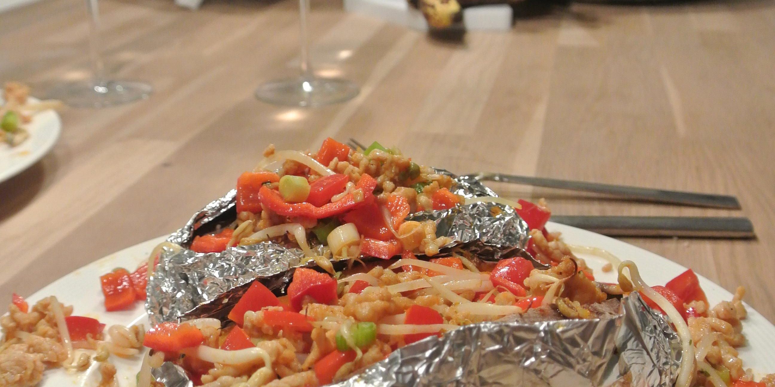 - Als de aardappelen uit de oven komen kan je ze met een mes in het midden doorsnijden maar niet het folie eraf halen. Duw de 2 helften voorzichtig uit elkaar en vul deze met het kipgehakt mengsel.